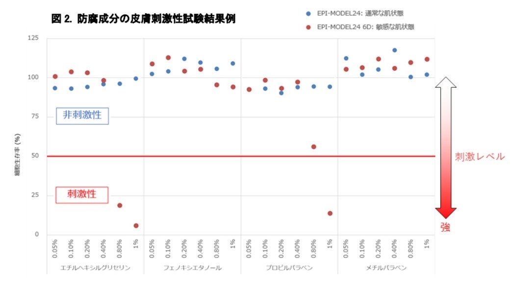 そこで、6社が共同し、株式会社ジャパン・ティッシュ・エンジニアリングの再構築三次元ヒト皮膚モデルEPI-MODEL24(図1左)を用いて、化粧品で汎用される16成分の試験を行いました。複数社で試験と検証をすることにより、信頼性があり、かつ化粧品業界の各社にとっても利用可能で有益なデータを取得することができました。(図2青丸)