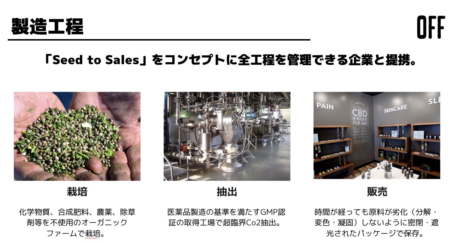 「Seed to Sales」をコンセプトに、製造の全工程を管理できる企業と提携。化学物質、農薬等を使用しないオーガニックファームで栽培し、GMP認証の工場で抽出し販売までを管理しています。一気通貫の製造により、高品質でリーズナブルな原料の提供を実現します。