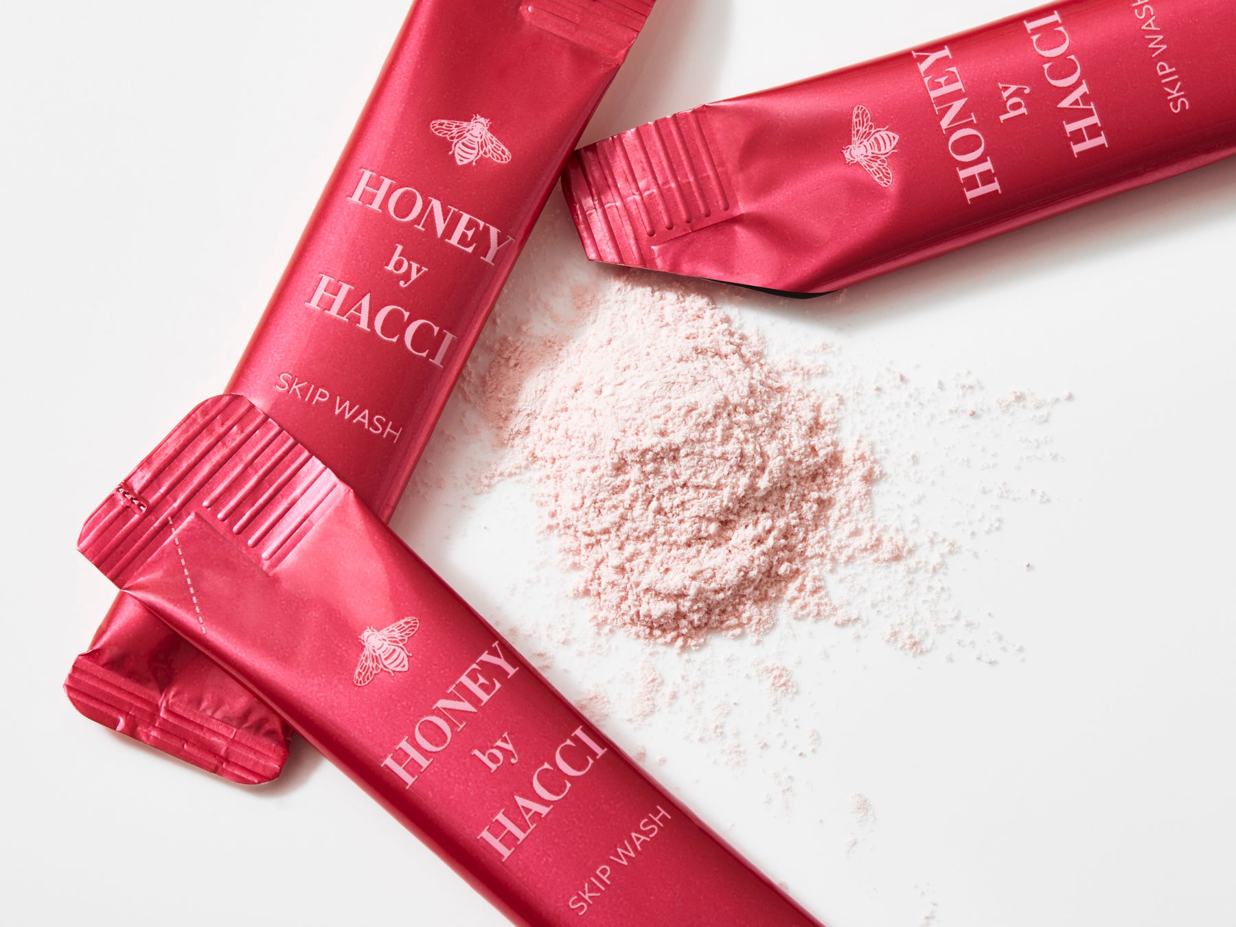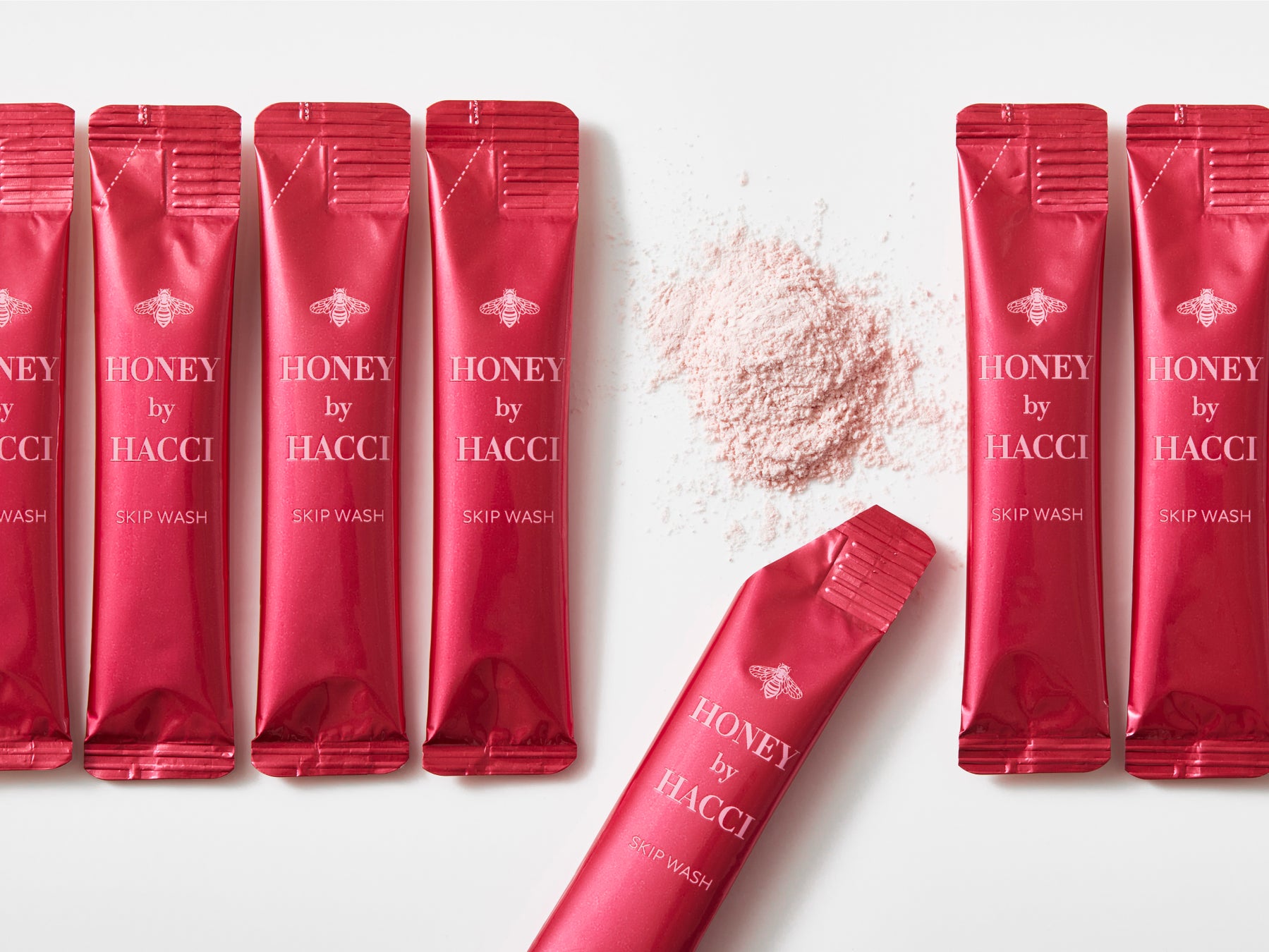 4月に限定発売され、即完売したハニー酵素洗顔パウダー「HACCI スキップウォッシュ」は、ご好評につき新商品として定番化。HACCI独自のハニーコーティング処方を使用。2種の微粒子酵素にはちみつ、ローヤルゼリーエキスとプロポリスをコーティングし、洗顔では落としきれない古い角質や汚れをオフします。