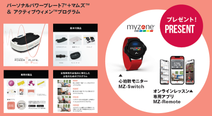 特典内容:「パーソナルパワープレート7®+マムズ™& アクティブウィメン™プログラム」のご購入で、心拍数モニター「MZ-Switch」(税込:19,800円)をプレゼント。さらに「MZ-Switch」と連動する専用アプリ「MZ-Remote」によるライブレッスンやオンデマンドオンラインレッスンが無料で受けれます。