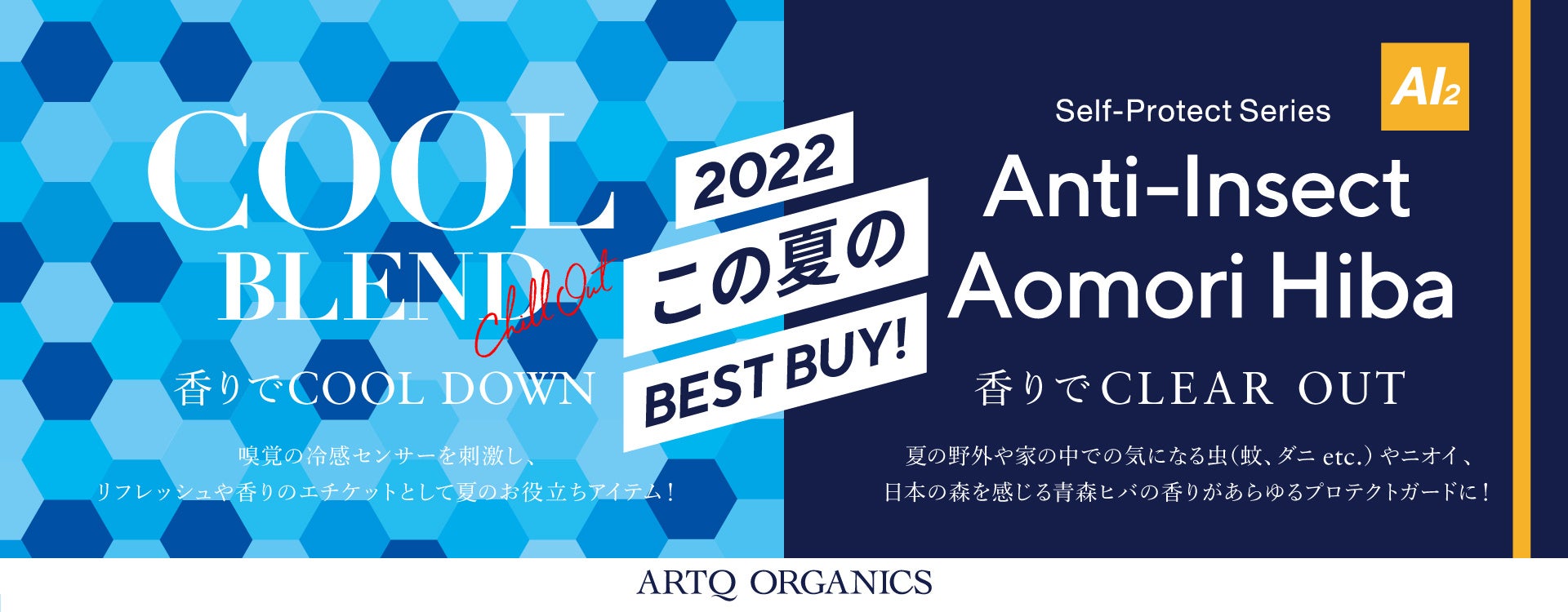 株式会社 Blue ink(本社:青森県青森市、代表取締役社長:アネルズあづさ)は、ARTQ ORGANICS(アロマティーク オーガニクス)より、『2022夏のBEST BUY! フェア』を2022年7月15日(金)-9月30日(金)に開催いたします。 嗅覚の冷感センサーを刺激し、リフレッシュや香りのエチケットとして、夏のお役立ちアイテム 「COOLクールブレンド2022」と、 日本の森を感じる青森ヒバの香りが、夏の野外や家の中での気になる虫(蚊、ダニetc.)やニオイ、あらゆるプロテクトガードに最適な「Anti-Insect Aomori Hibaアンチインセクト青森ヒバ」をお得なセットにしてお届けいたします。夏の定番の香りとしてどんなシーンにも使いやすく、お仕事中やお出かけ時を快適に過ごすことができる、夏の必需品、旅行やレジャーの“必須アイテム”です。