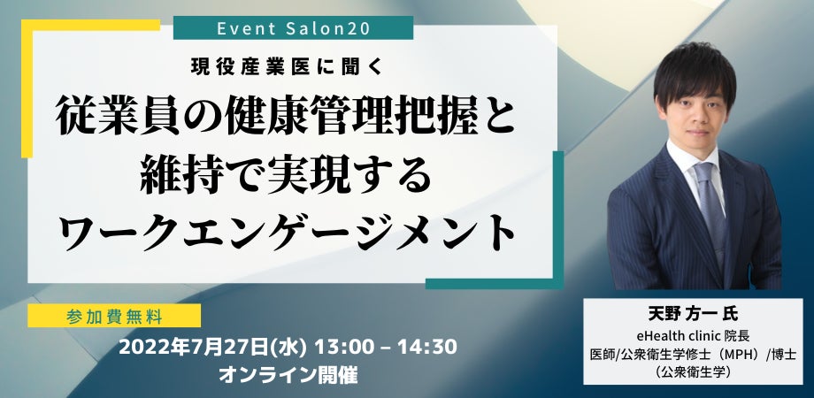 本セミナーでは、日本医師会認定産業医で、ワークエンゲージメントに関する研究を行う天野 方一医師に登壇いただき、従業員の健康管理の重要性や、ワークエンゲージメントを向上させる方法について、医学的な知見から解説をいただきます。