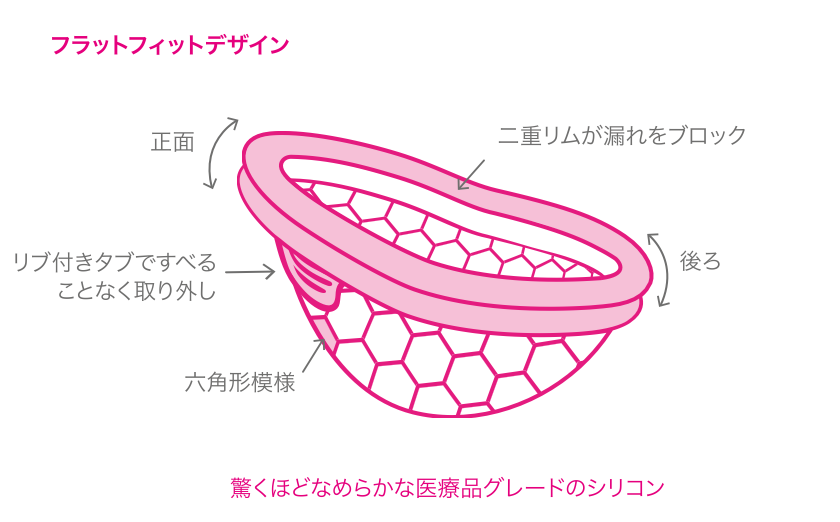 柔らかく花びらのような薄さのボディは挿入しやすく、体形にフィットするので装用していることを全く感じません。漏れをブロックする二重リム、すべらずに取り外せるリブつきタブで、どんな状況でも最高の安心感が得られます。