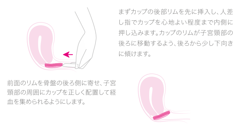 4、  前面のリムを骨盤の後ろ側に寄せ、子宮頸部の周囲にカップを正しく配置して経血を集められるようにします。