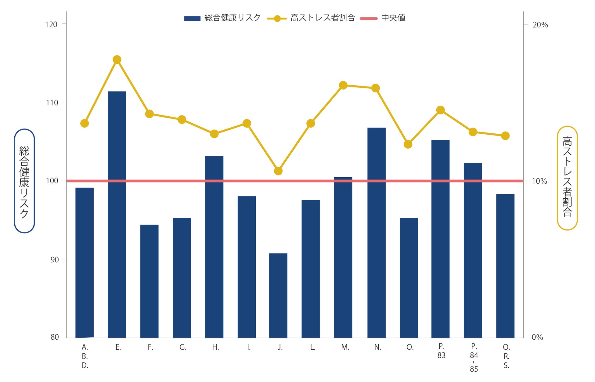 比較の基準としている「全国(厚労省データ)」は、“厚生労働省科学研究費補助金労働安全衛生総合研究事業「職業性ストレス簡易調査票及び労働者の疲労蓄積度自己診断チェックリストの職種に応じた活用法に関する研究」平成19年度総括・分担報告書 表4 職業性ストレス簡易調査票下位尺度の職種別平均値及び標準集団との比較”が出典です。集計につきましては、事業者様のデータについて全参加者データ・男性参加者データ・女性参加者データの3軸に分け、高ストレス者の出現割合、健康リスク、各尺度の平均値を業種ごとに算出しました。なお全参加者データにつきましては、「男性」の基準値を用いて総合的な数値の算出、比較・分析を行っております。