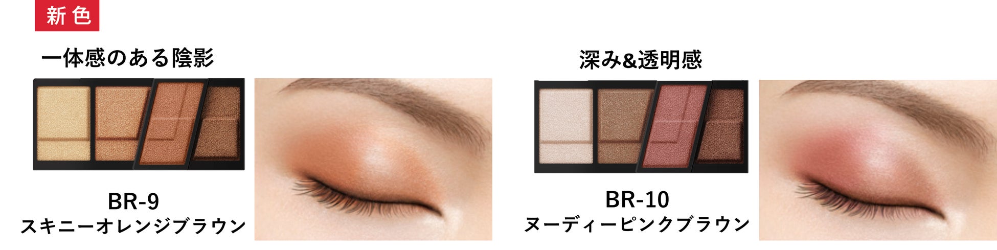 新色は、一体感のある陰影をもたらす「スキニーオレンジブラウン」と、深みと透明感を演出する「ヌーディーピンクブラウン」の2色が加わります。肌なじみがよく、トレンドの抜け感メイクにおすすめです。