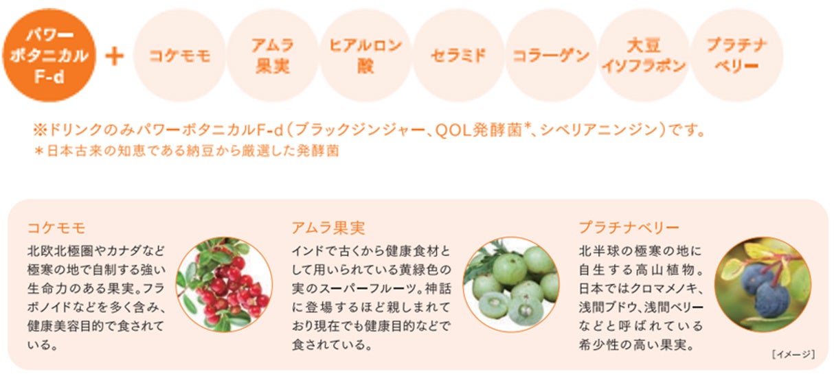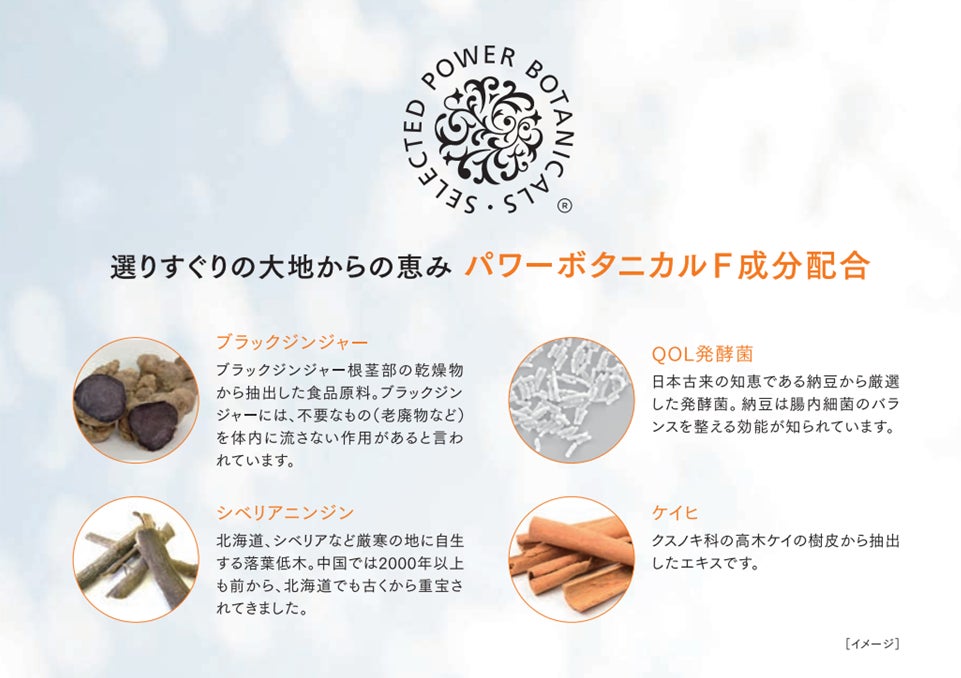 〇東洋の知恵、植物の力・大地からの恵みを選りすぐったパワーボタニカル F-d(ブラックジンジャー、QOL発酵菌、シベリアニンジン)、【美容特許成分】コケモモとアムラ果実、コラーゲン、セラミド、ヒアルロン酸、プラチナベリーなど配合。