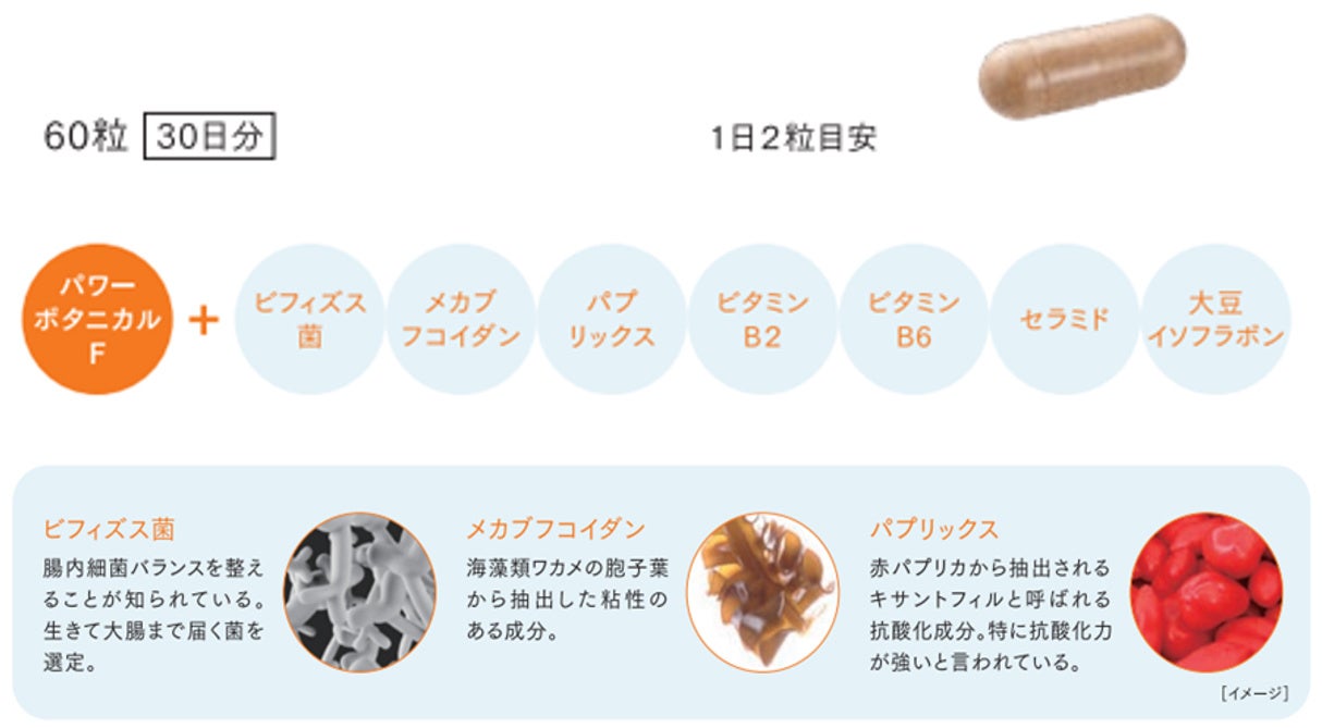 〇東洋の知恵、植物の力・大地からの恵みを選りすぐったパワーボタニカルF(ブラックジンジャー、QOL発酵菌、シベリアニンジン、ケイヒ)、ビフィズス菌、 メカブフコダイン、ビタミンB2・B6など配合。
