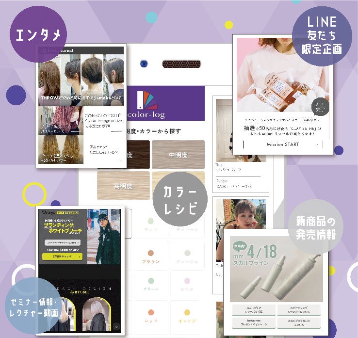 最大の特長は、ヘアカラーに特化した充実したサポートコンテンツです。お友達追加に加え、会員登録していただくことで、業界で活躍する「ヘアカラーとSNS」を熟知した人気美容師達(今後も新メンバーが参画予定)による、毎月30スタイル以上のオリジナルのトレンドカラーレシピやスタイル画像など、LINE内でしか見られない鮮度の高いスペシャルコンテンツをご覧いただけます。さらに「明度×色相」、「スタイル」などのキーワードや、カラーチャートの色別といった様々な検索軸からのレシピ検索を可能とし、使い勝手の良さも追求。人気美容師のカラーレシピ情報から表現の幅を広げるヒントを得たり、カウンセリングツールとしてもご活用いただけます。