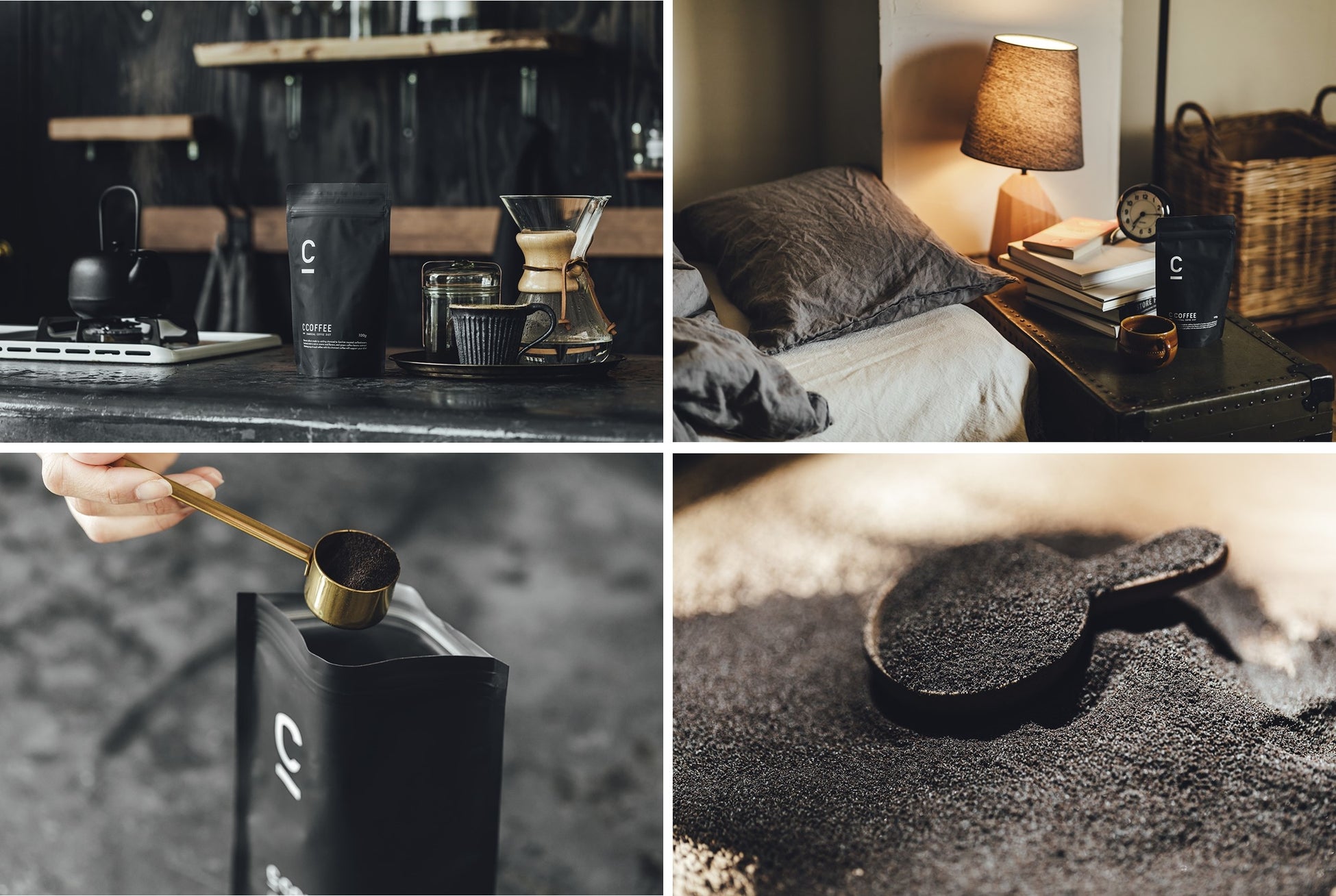 C COFFEEは、長野県伊那地方のゼロ磁場地帯“分抗峠”周辺に生える赤松のみを採取し独自製法で炭化した「伊那赤松妙炭」など5種類の国産炭を使用。油や不要なモノを吸着します。