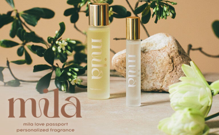 「love passport mila」は、オンライン上で「好みの香り」や「使いたいシーン」などの質問に回答することで、あなたにぴったりのオードトワレ(7.5ml)とヘア&ボディオイル(40ml)を組み合わせたフレグランスセットを初回4,268円(税込)/2回目以降6,138円(税込)で毎月お届けいたします。気分や季節の変化に合わせてマイページで再度質問に回答することで、翌月は新たな香りにアップデートされるサブスクリプション型となっております。