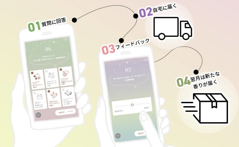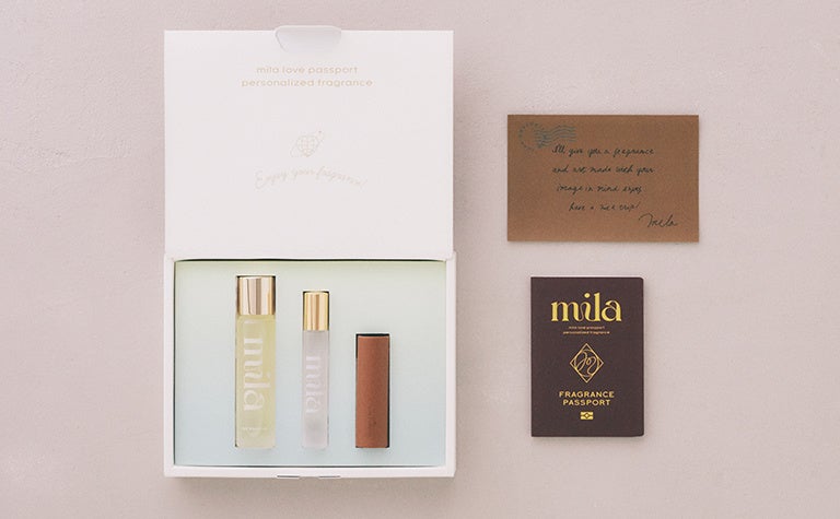 「love passport mila」は、オンライン上で「好みの香り」や「使いたいシーン」などの質問に回答することで、あなたにぴったりのオードトワレ(7.5ml)とヘア&ボディオイル(40ml)を組み合わせたフレグランスセットを毎月お届けいたします。気分や季節の変化に合わせてマイページで再度質問に回答することで、翌月は新たな香りアップデートされるサブスクリプション型となっております。