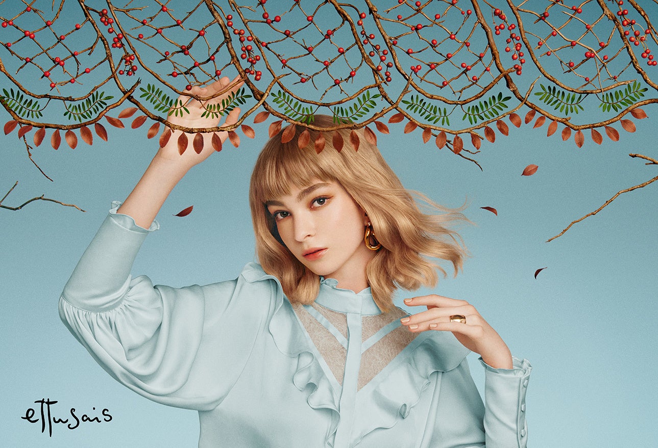 2022.Autumnのシーズンテーマは「ヴィンテージムード」。新シーズンビジュアルは、秋らしい深みと暖かさのあるカラー、草木でつくられたレースのモチーフがヴィンテージ感を表現。メイクとリンクしたニュアンスカラーの髪が秋風になびいて季節の移ろいを感じさせます。