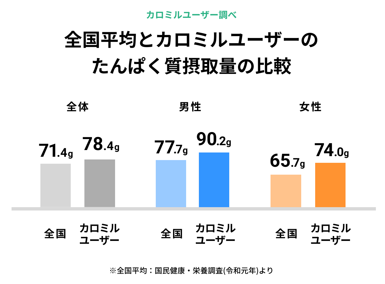 たんぱく質の平均摂取量は、厚生労働省により行われた最新の国民健康・栄養調査(令和元年)では71.4g、カロミルユーザーは78.4gという結果に。男女別での調査でも、男性は国民健康・栄養調査では77.7gであったのに対しカロミルユーザーは90.2g、女性は国民健康・栄養調査では65.7gであったのに対し、カロミルユーザーは74.0gであることがわかりました。