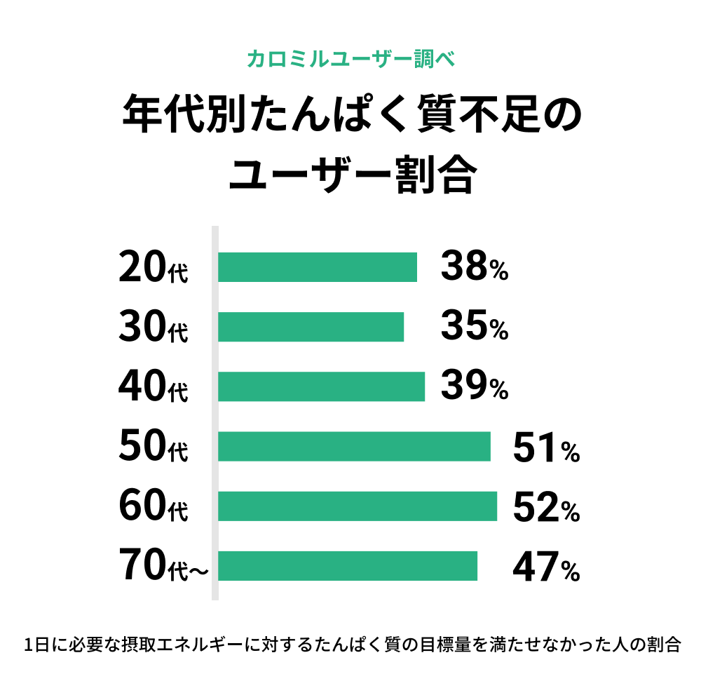 40代までは40%以下にとどまっている一方で、必要となるたんぱく質量が増える50代以上を見ると、50代、60代で半数以上が必要量を摂取できていないという結果に。50代から必要となるたんぱく質量が増えることから、年齢が上がるにつれて必要量のたんぱく質量が摂取できていない人が多くなっています。