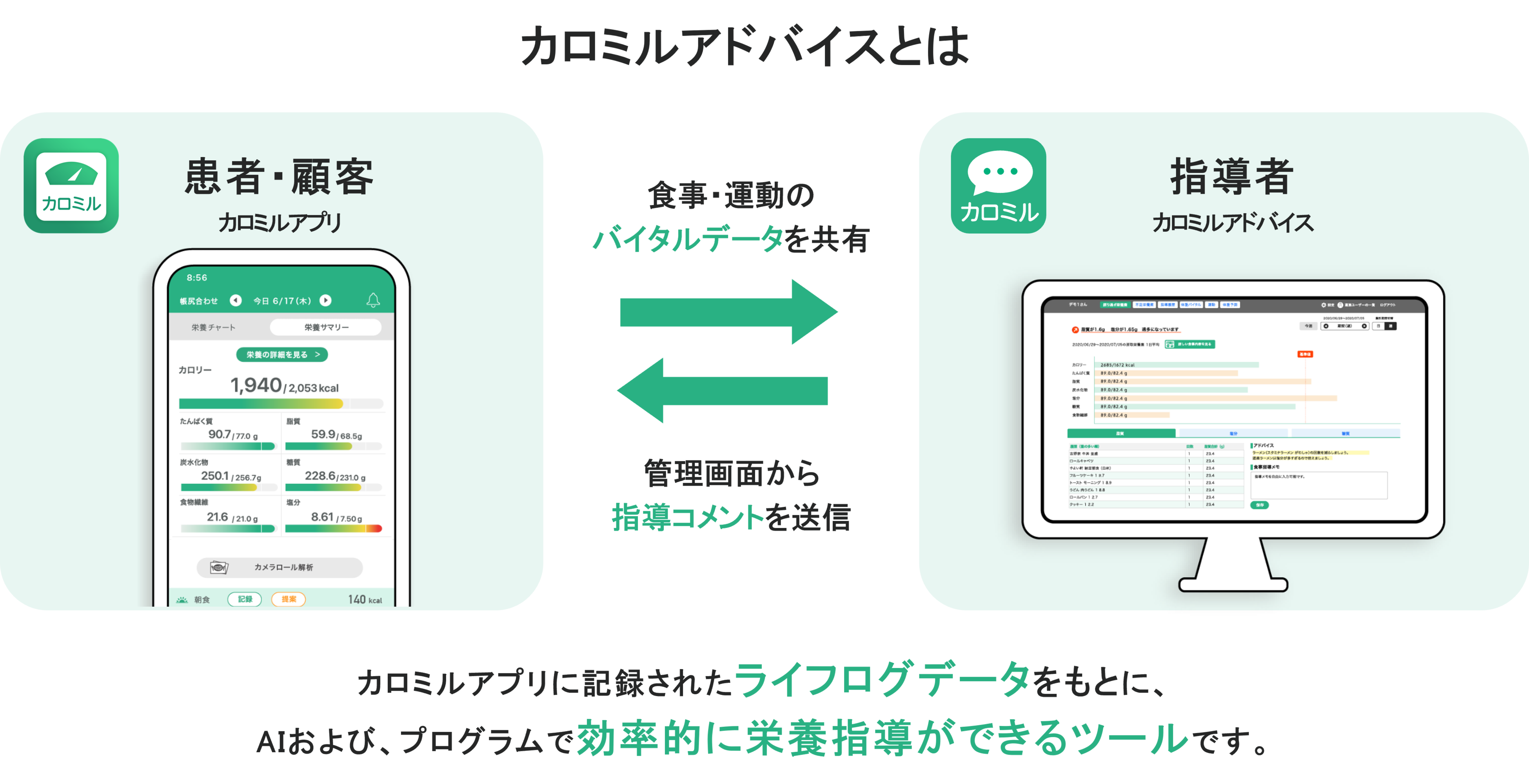 指導対象者(顧客)の「カロミル」アプリと連携し、食事や栄養指導がすべてオンライン上で完結できる、指導者向けのウェブツールです。指導対象者(顧客)の食事データの記録・蓄積が自動化されるだけでなく、AIが食事内容を自動で解析・栄養計算し、指導者の栄養計算など食事指導にかかる手間が大幅に削減されます。