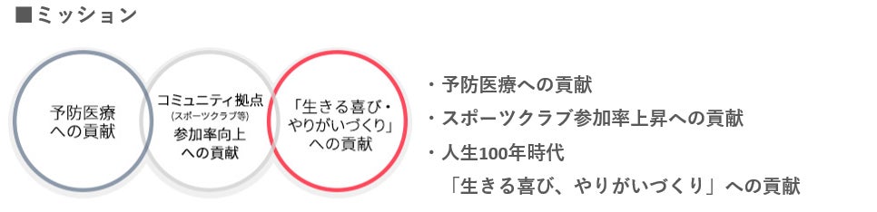 私たちには夢があります。それは、「スポーツ・健康・美容」をテーマにした、人がふれあい笑顔があふれるウエルネスコミュニティ拠点を創り出すこと。そしてそのウエルネスコミュニティ拠点を全国各地に広げ、人々の笑顔の輪を増やすことです。高齢化が進む社会で大切なのは、人と人とのつながりです。「愉しみと心地よさ、そして生きる喜びをも与える」社会(サービス)の実現を目指します。勇気をなくさず、信念を持って、情熱を注ぐことを念頭に置き、全社一丸となって、以下の3つのミッションに取り組んでいます。