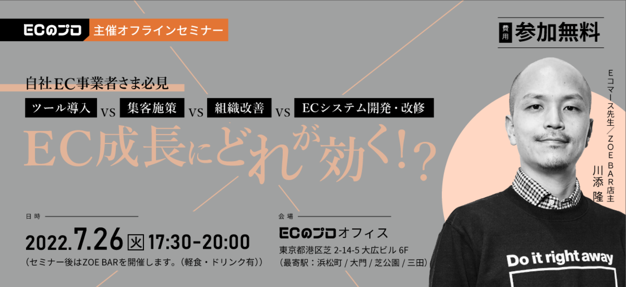 スピーカーとして、EC業界のトップランナーである川添 隆氏(Twitter:@tkzoe)が登壇!またセミナー終了後は、「出会いと交流の場”ZOE BAR”」を開催いたします。完全無料ですので、下記フォームよりぜひお気軽にお申込みください。