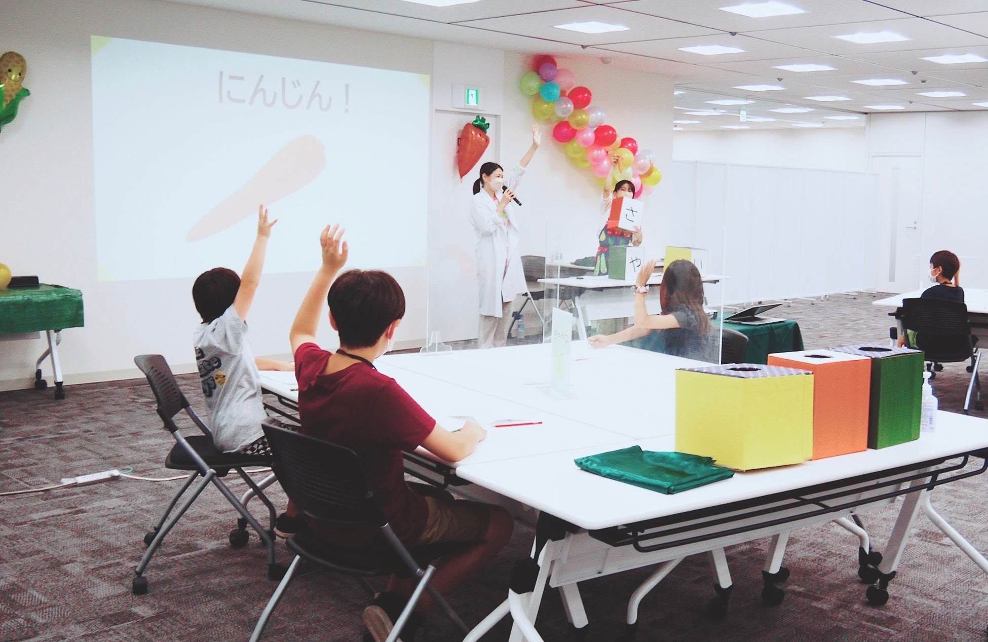 第一部「やさいのがっこう」では先生役の社員が白衣姿で登場し、「やさい先生」として子どもたちに授業をしました。