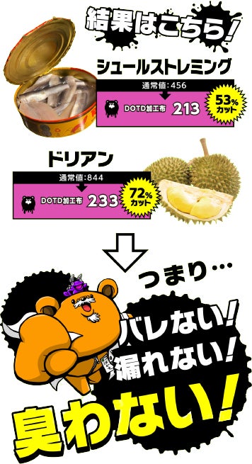DOTDは、強烈な臭さで世界的に有名な「シュールストレミング」や「ドリアン」のニオイもカットできることが実証実験によって証明されています。DOTDで加工した布の上からシュールストレミングやドリアンの臭気指数を測定したところ、なんとシュールストレミングは53%・ドリアンは72%数値がカットされました。