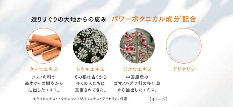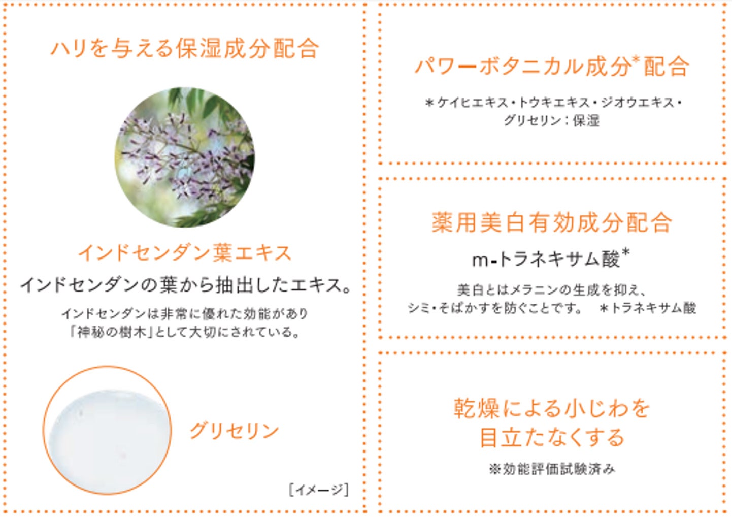 ◆ 植物の力・大地からの恵みを選りすぐったパワーボタニカル成分(ケイヒエキス・トウキエキス・ジオウエキス・グリセリン:保湿)に加え、薬用美白有効成分(m-トラネキサム酸※1)、ハリを与える保湿成分(インドセンダン葉エキス・グリセリン)を配合。