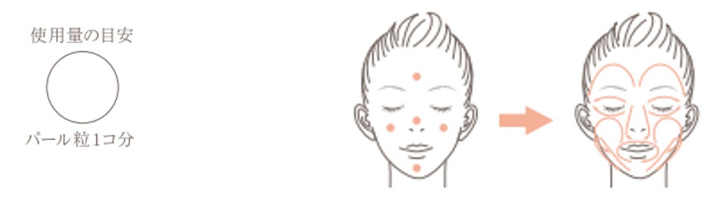 ●夜のお手入れの最後に、指先にパール粒1個分を目安にとり、顔の5カ所(両ほお、額、鼻、あご)においてから顔全体にていねいになじませます。