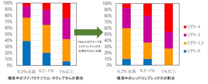 左:図1a フゾバクテリウム・ヌクレアタムの唾液中の割合とCPIの関係 右:図1b フゾバクテリウム・ヌクレアタムの唾液中の割合が高いグループ(≧1%)におけるレッドコンプレックスの割合の違いとCPIの分布