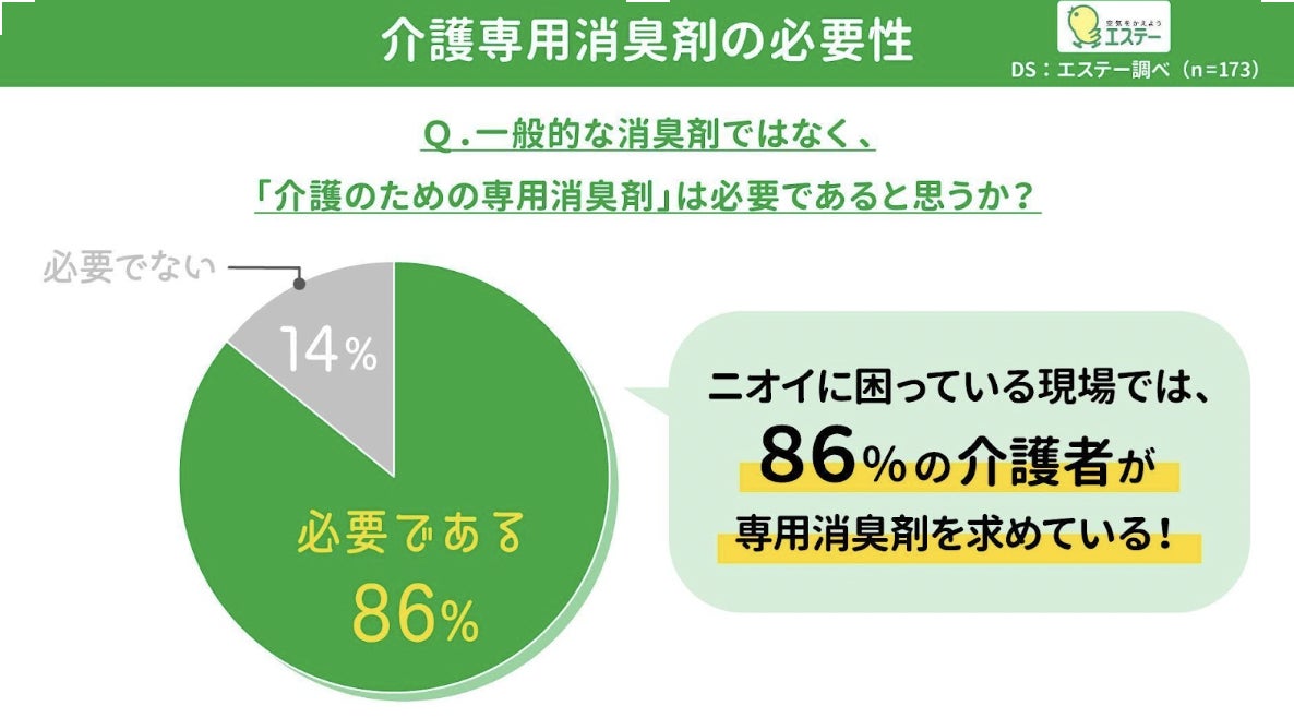 介護現場へのエステー株式会社のアンケート調査では多くの介護者が介護空間のニオイに効く専用の消臭剤を求めているということもわかっています。