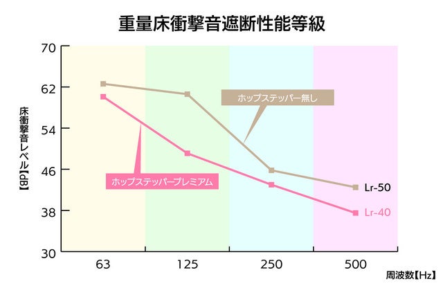 ホップステッパープレミアムありと無しで遮音性試験を実施しました。上の階で発生した衝撃音がどの程度の音量で下の階に届くかを計測した結果、特級レベルの遮音性能がありました。