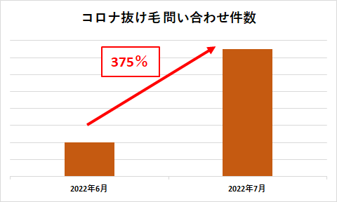 2021年11月にピークを迎えていたコロナ抜け毛に関するお問い合わせですが、2022年7月はピーク時と同等の問い合わせがあり、6月と比べると375%(見込み)に急増しています。コロナ感染症自体の症状が軽症であっても、コロナ抜け毛が起こったという患者様も多いため、注意が必要です。