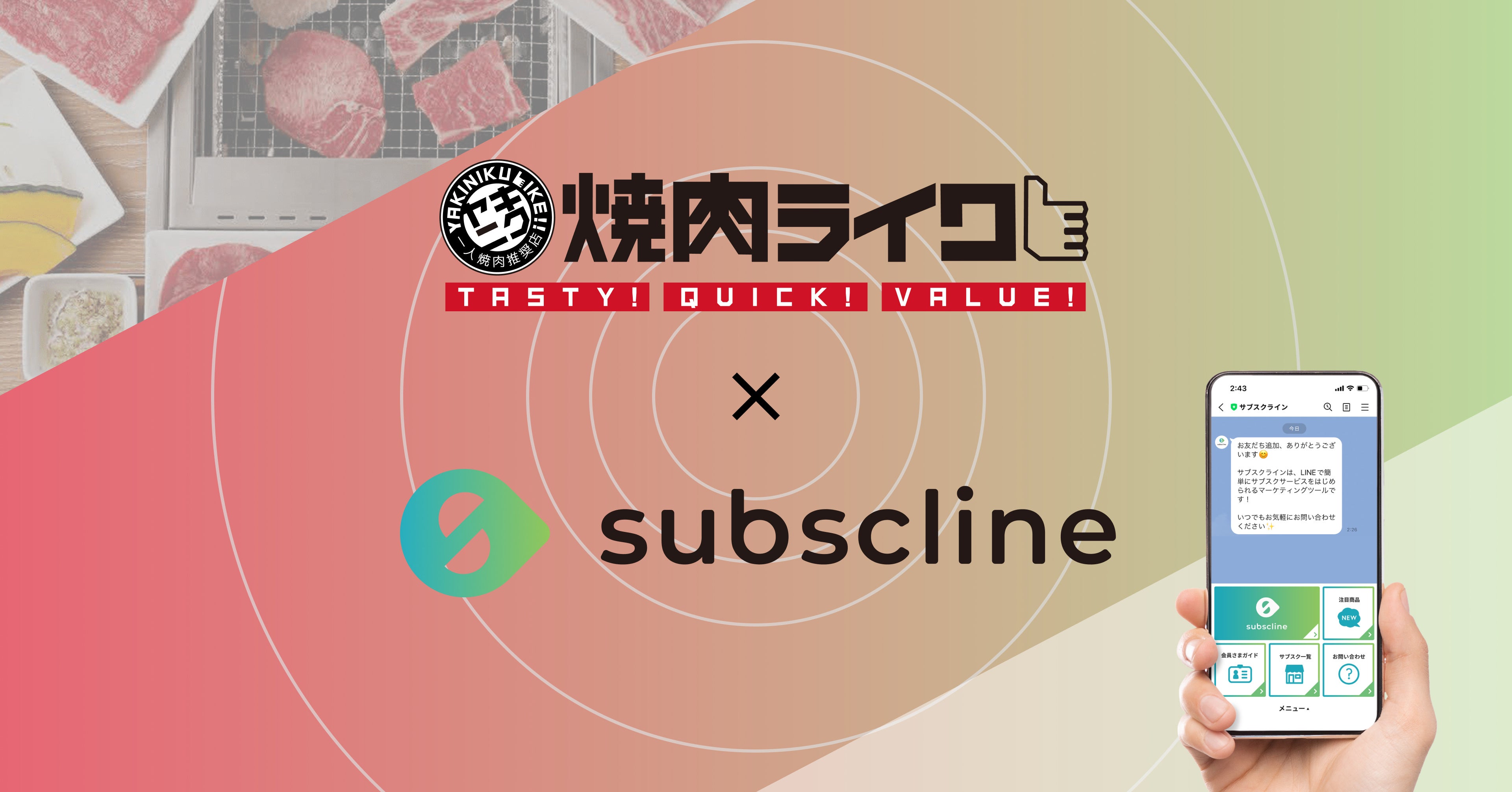 株式会社サブスクライン(本社:東京都渋谷区、取締役社長:宇野涼太)は、株式会社焼肉ライク(本社:東京都渋谷区、代表取締役:有村壮央)にLINEサブスクシステム『サブスクライン』を提供し、「焼肉フィットネス」サブスクの導入サポートを行います。本サブスクは7月25日(月)朝7時より100名様限定で先行販売予定です。