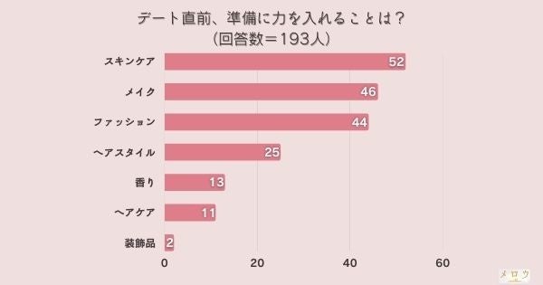 「デート直前、準備に力を入れることは?」とアンケート調査した結果、1位は『スキンケア』でした。