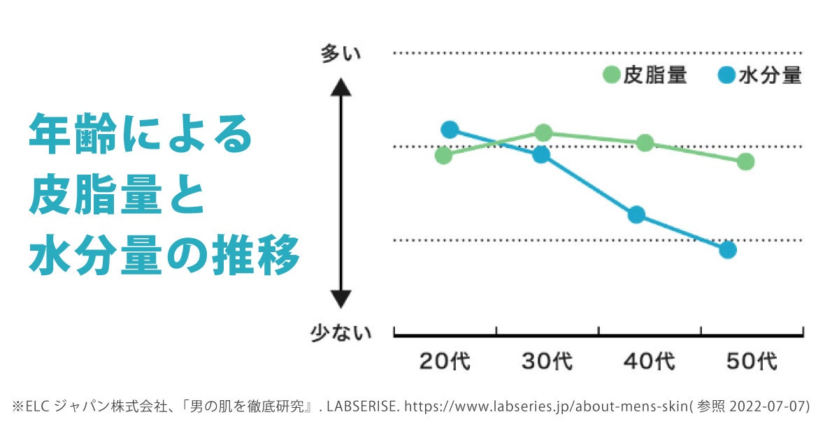 男性の肌は女性の肌と比べて、皮脂分泌量が2〜3倍、水分蒸散量は2倍以上であると言われています。つまり、30歳を過ぎた肌は乾きっぱなしの状態です。年を取るにつれて、毛穴の目立ちやカサつき、シワが増えた、肌が乾燥しやすい、老けて見られる、肌にハリがない、くすんで見える、肌にキメがない、たるみが気になるなどにお悩みの男性も多いのではないでしょうか。