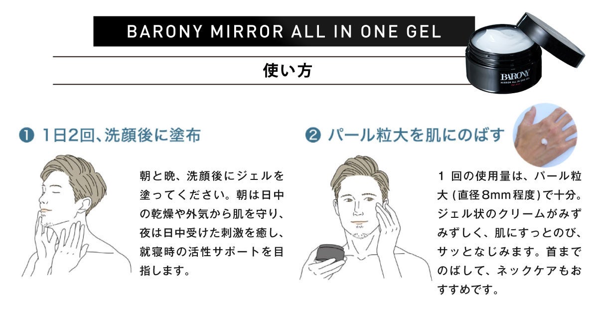 中高年の男性向けの商品を提供する京福堂では、『指定医薬部外品 プロキオン』シリーズを筆頭に、累計販売総数200万個を突破し、これまで多くの男性の悩みに向き合ってきました。そんな当社に寄せられた年齢肌・乾燥肌に関するお悩みを解決するために、男性セルフケアの先駆者として開発したのが、大人の乾燥肌のための「男性専用オールインワンジェル」である『BARONY MIRROR ALL IN ONE GEL』です。