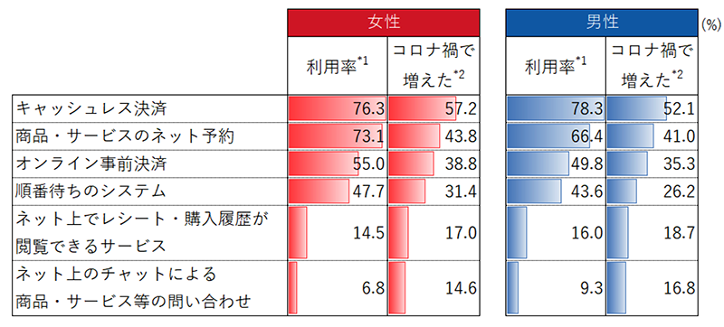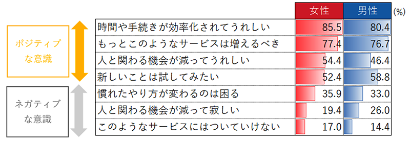 「オンラインやデジタルツールを使ったサービス」に対しては、「時間や手続きが効率化されてうれしい」が男女とも8割を超える。次いで、「もっとこのようなサービスは増えるべき」が男女とも7割を超える。