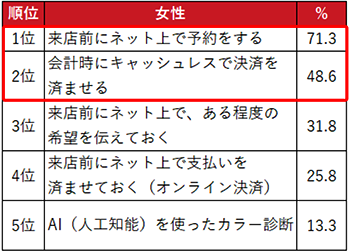 美容サロンで利用したい「オンラインやデジタルツールを使ったサービス」の男女1位にランクインした「ネット予約」は、ここ10年で利用が大きく伸びたサービス。特にコロナ禍では、「予約をしてからサロンに行きたい」というニーズがさらに高くなりました。2位の「キャッシュレス決済」も、コロナ禍に「現金でのやりとりを控えたい」という背景から美容サロンでの利用ニーズはより高まったのではないでしょうか。また、一般的に「キャッシュレス決済」の利用が日常化するようになったため、美容サロンでも利用したいというニーズが生まれているとも考えられます。