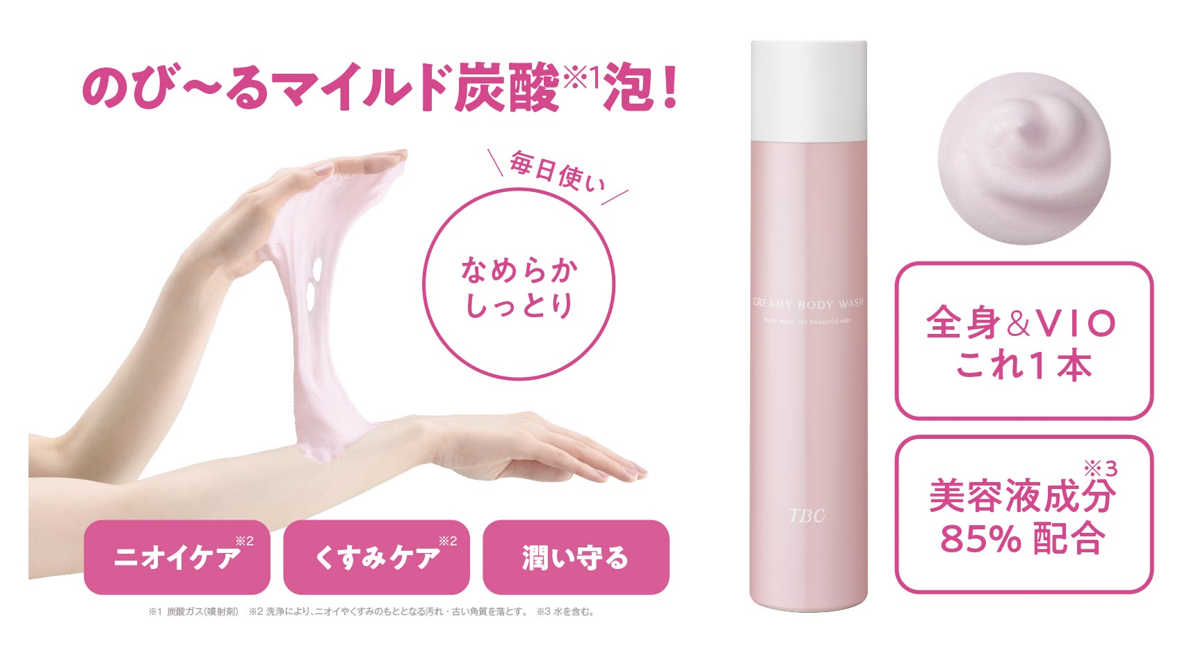 TBCグループ株式会社(本社:新宿区)は、2022年8月1日(月)、「TBC クリーミーボディウォッシュ」を新発売いたします。「TBC クリーミーボディウォッシュ」は、きめ細かい濃密泡で全身をなめらかにしっとりと洗い上げる、全身洗浄料です。のび感が特徴的なマイルド炭酸※1泡が、肌の凹凸にもくまなく密着。また、VIOにも使用可能です。通販コスメサイト「TBCオンラインショップ」にて先行販売いたします。