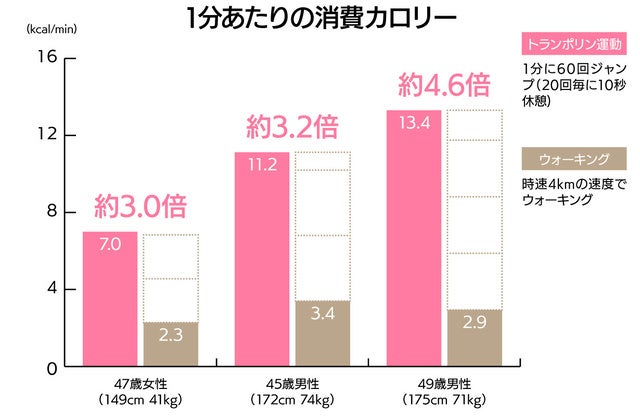 1分間のウォーキングと本商品を使用したトランポリン運動とを比較すると、消費カロリーがウォーキングに比べ約3倍以上という結果が出ました!