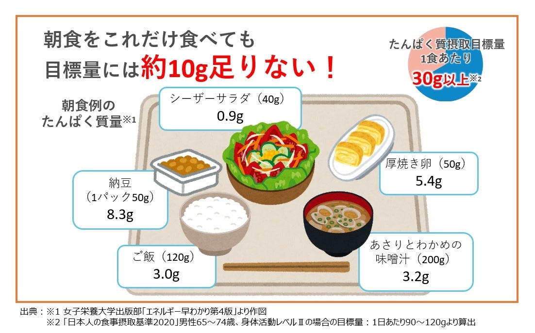 右のイラストは朝食例のたんぱく質量を表しています。納豆やシーザーサラダのチーズなど、たんぱく質源も取り入れてかなりしっかり食べているようですが、それでも1食あたりの目標30gには、約10g足りないのです。