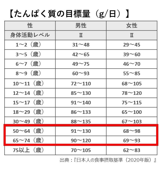 厚生労働省では、国民の健康維持増進のために必要なエネルギーや栄養素の量の基準を『日本人の食事摂取基準』として発表しています。 2020年版では、 50歳以上の年齢区分で、たんぱく質「目標量」の下限値が引き上げられました。50~64歳、65~74歳では若い世代よりも下限値が高く、男性では育ち盛りの15~17歳と同等の目標量の数値が設定されています。