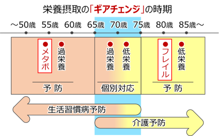 64歳までは生活習慣病予防のための過栄養がリスクとなりますが、65歳以上の高齢期になると、低栄養がリスクへと変わります。低栄養は運動機能の低下を加速させる因子となりフレイルへと陥る恐れがあります。そこで65~75歳のあたりから体調を見極め、低栄養ケアへのギアチェンジが必要になります。