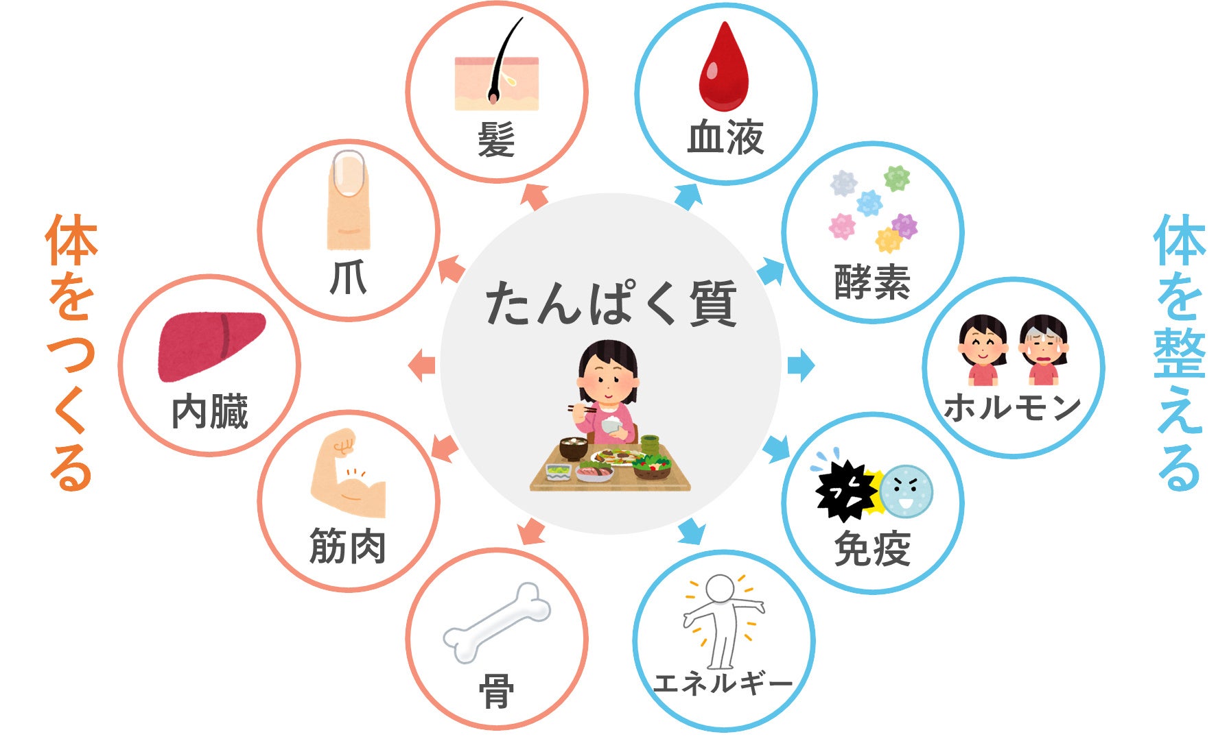 三大栄養素の一つであるたんぱく質は健康な生活を送るための重要な役割があり、「体をつくる」ことと「整える」こと(生体機能の調節機能)に分けられます。
