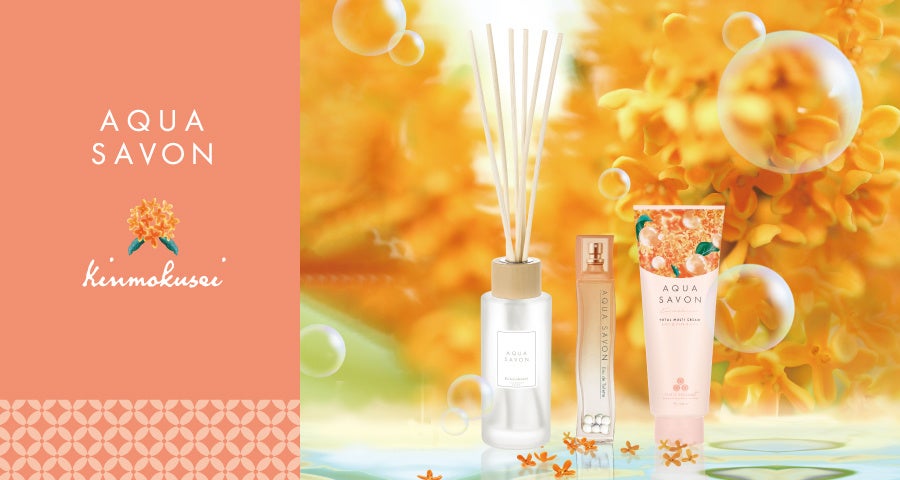 2020年からその人気が高まり(※2)、今では秋の訪れを告げるフレグランスとして定着した“きんもくせいの香り”。春季「サクラフローラルの香り」、冬季「ゆずの香り」が累計出荷本数27万本(※1)を突破と、季節の香りが人気の「アクア シャボン」から、待望の『きんもくせいの香り』が登場。甘く華やかなきんもくせいにシャボンの爽やかなニュアンスが調和し、他にはない“生活に取り入れやすい香り”に仕上げました。お出かけ前に「オードトワレ」、お風呂上りに全身に使える「トータルマルチクリーム」、おうち時間に「リードディフューザー」と、