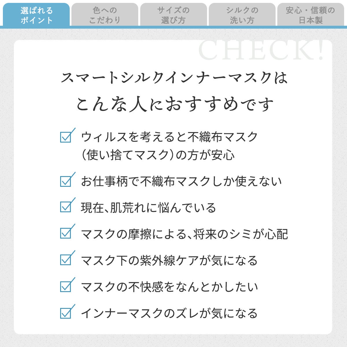 お肌が悲鳴をあげている。医療・介護など不織布マスクを仕事で絶対つけなければいけないのに、肌と不織布マスクが合わず毎日悩んでいる女性の声に私たち絹織物工場が正面から向き合い開発したスマートシルクインナーマスク(素材:絹100%)。