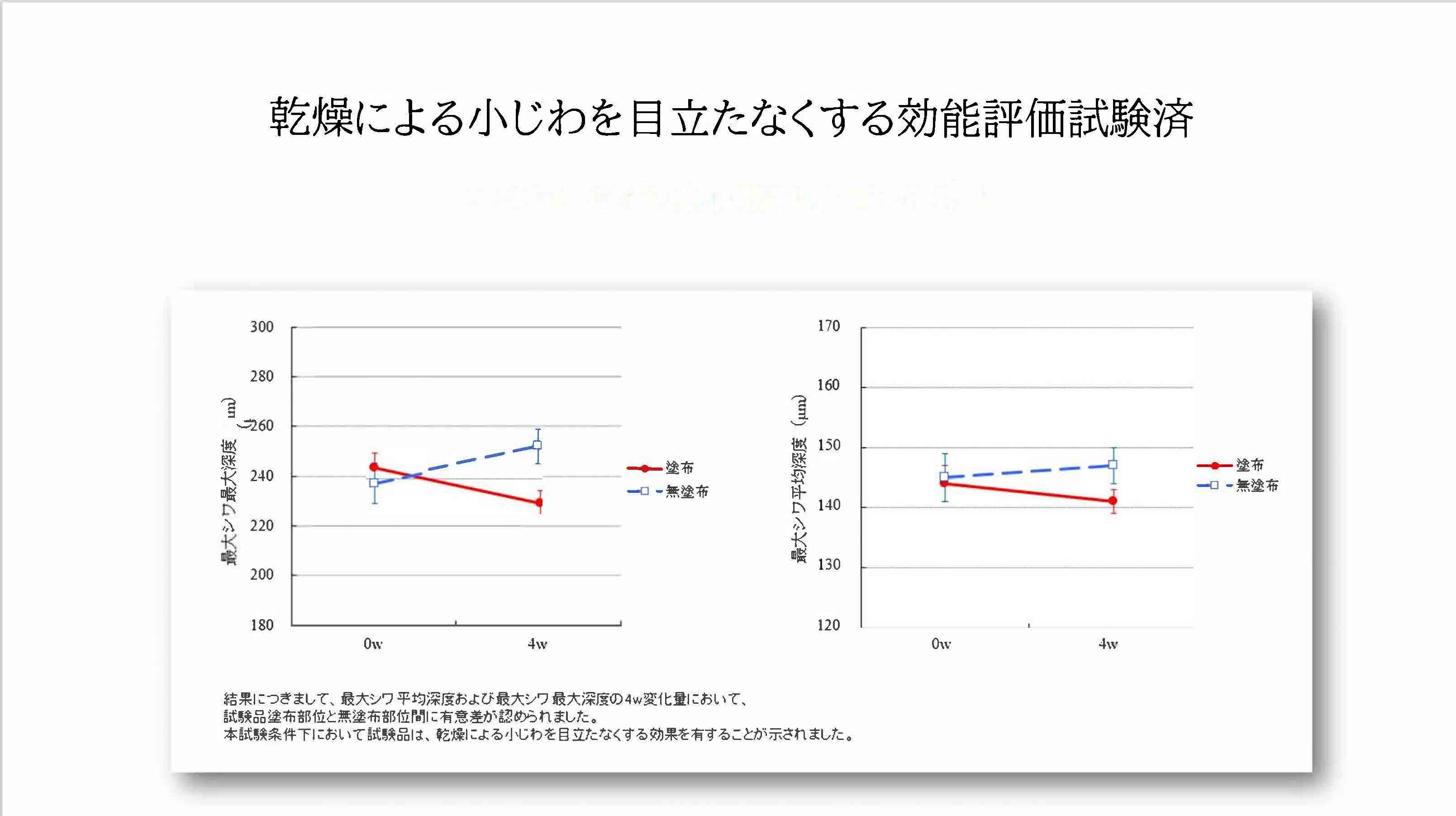 健康食品に配合され、多くの学会や学術誌に取り上げられる健康寿命の栄養サポートに効果があるとされる注目の成分レスベラトロールと類似構造を持つプテロスチルベンを特許製法を用いて糖鎖をつけ、安定化に成功したプテロスチルベン配糖体。このプテロスチルベン配糖体が、INCI名:レスベラトロールジメチルエーテルグルコシドとして、世界で初めて化粧品原料として登録されました。この新原料はリッチなクリーム製剤に配合する事が良いされる研究結果を見て、Deaiwoの主力商品「デアイヲビヨウエキクリーム」はまさしく濃厚リッチなクリーム製剤である事から、世界初原料を追加配合を決定。化粧品研修者との会議を重ね、処方調整を繰り返し、独自モニター調査や第3者機関での乾燥による小じわを目立たなくする効能評価試験も実施済み。試験結果データによると、最大シワ平均深度の4週間変化量において、無塗布部分と塗布部分において有意差が認められる結果が示されています。