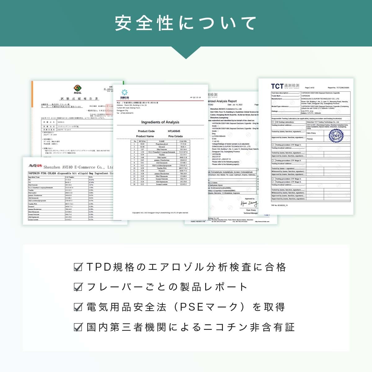 日本国内の第三者機関(一般財団法人日本文化用品安全試験所)による厳格な成分分析のもと、世界レベルの厳しく衛生管理された環境で生産されています。また、吐き出したミストに対するエアロゾル分析検査(TPD規格)にも合格しています。本体に関しても電気用品安全法(PSEマーク)を取得。安全なフレーバーを安全なシーシャデバイスでお楽しみいただけます。