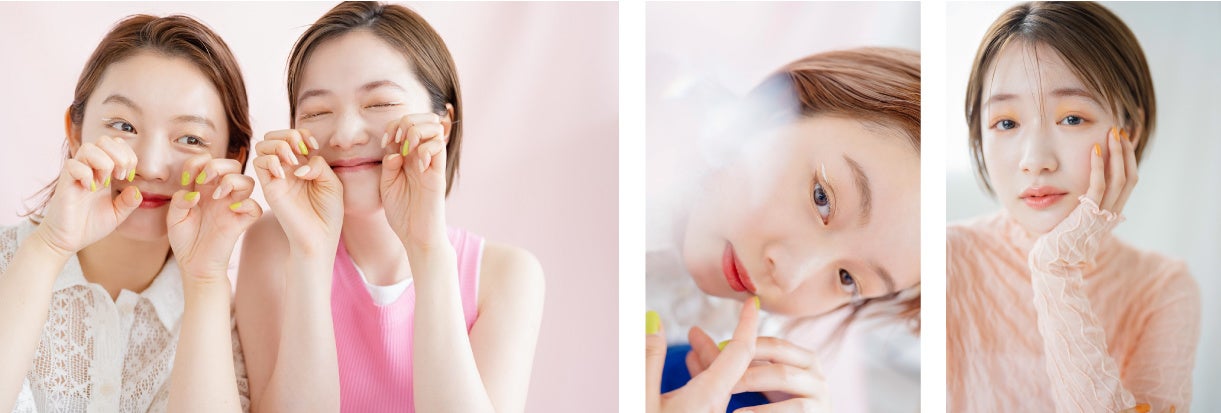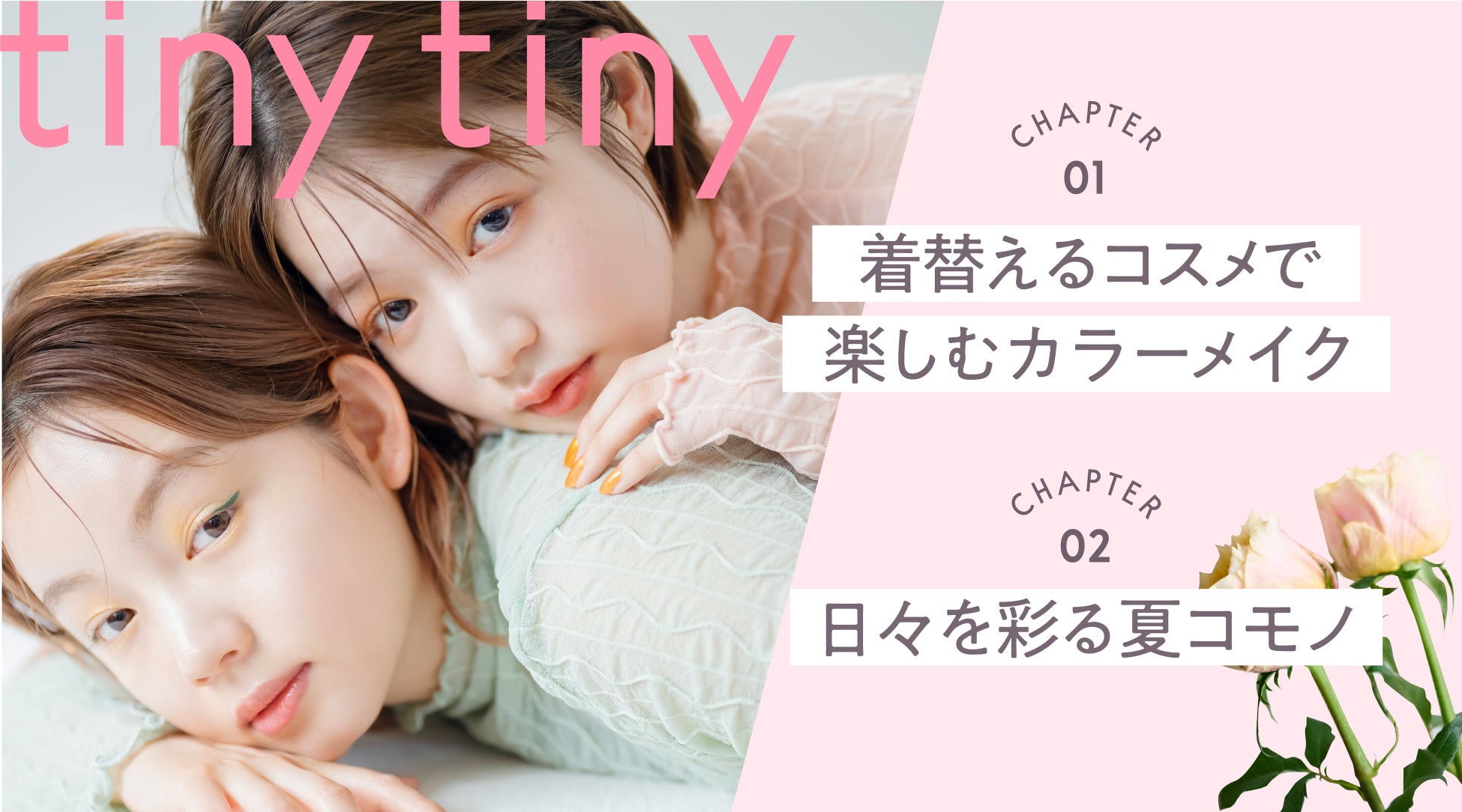 最新ビジュアルは2パートで構成。CHAPTER 01は「着替えるコスメで楽しむカラーコスメ」と題し、使い切りサイズでカラーバリエーションが豊富なtiny tinyのコスメならではの提案で、夏は好きなコーデを楽しむようにメイクも気分やファッションに合わせて楽しんでいる「とみい」さんと「いしだちひろ」さんのシミラーメイクルックを表現します。