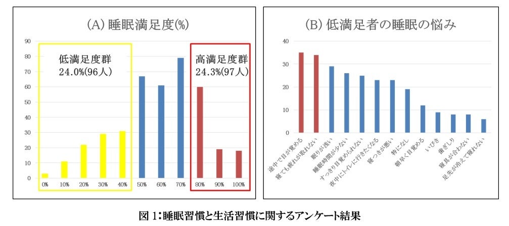 昨今、コロナ禍の自粛生活により睡眠の不調を感じるという声が多くなっているため、30~60代の各100人の女性、計400人を対象に「睡眠習慣と生活習慣に関するアンケート」を実施しました。睡眠満足度が40%以下と回答したのが全体の24.0%(96人)、睡眠満足度が80%以上と回答したのは全体の24.3%(97人)という結果になりました(図1のA)。前者を低満足群、後者を高満足群として、睡眠の悩みを調査したところ、低満足群の2大悩みは、「途中で目が覚める」と「寝ても疲れが取れない」ことであると分かりました(図1のB)。