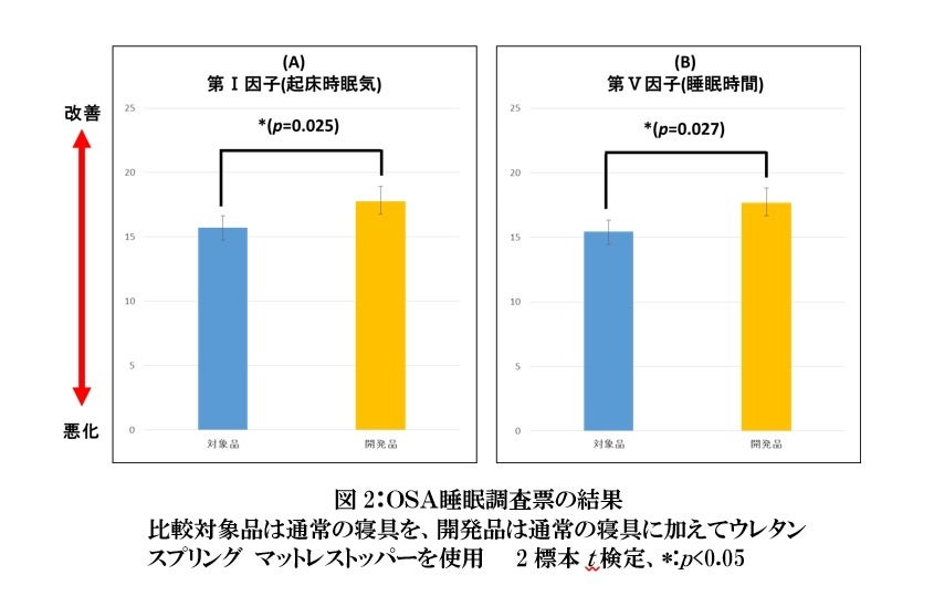 その結果、ウレタンスプリング マットレストッパーを使用して就寝した場合、第Ⅰ因子「起床時眠気」(2)については、比較対象品に対して有意にスコアが増加して改善が見られました(図2のA)。加えて、第Ⅴ因子「睡眠時間」(2)についても、睡眠時間が長くなったという回答が多く、改善が見られました(図2のB)。