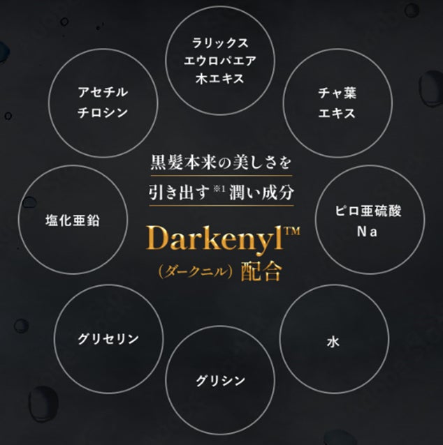 沿った、50種類の養潤(潤い)成分と黒髪本来の美しさを引き出す※1潤い成分Darkenyl™(ダークニル)※3を配合。頭皮・髪用トリートメントで、頭皮環境を整え、黒々と健やかな黒髪本来の美しさを引き出します※1。
